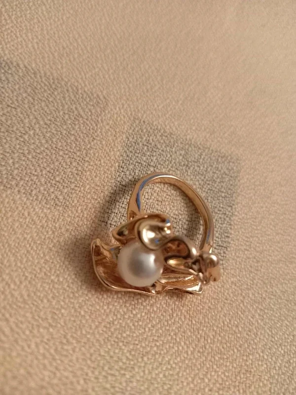 Bohemian style Ring with White Pearl imitation. Irregular wave pattern with gold plating.