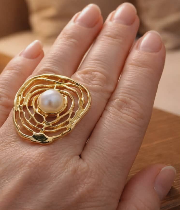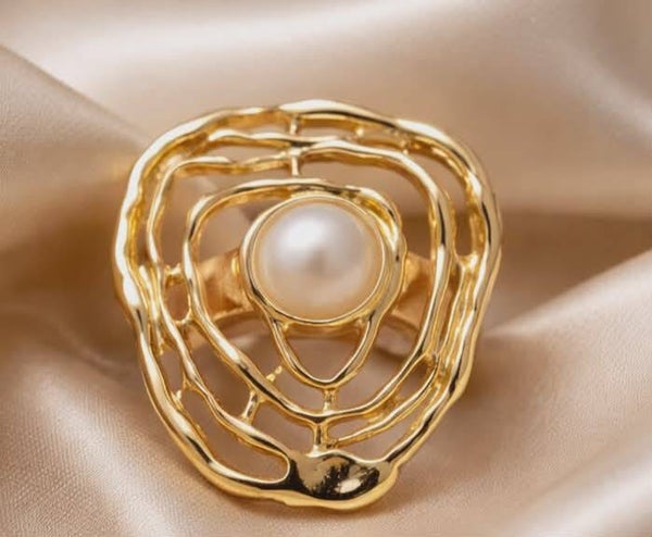 This beautiful ring is plated with KC gold to add a touch of elegance to any outfit. Adjustable piece recommends gently stretching it to a maximum of one size. The faux resin pearls are beautifully crafted, giving the ring a luxurious and timeless look.